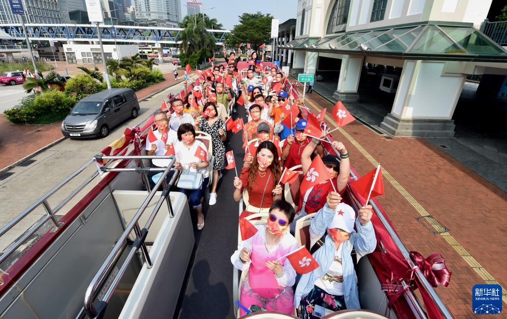 10月1日,在香港街头,参加庆祝国庆巴士巡游的人们挥动国旗和香港特区区旗。新华社记者 卢炳辉 摄
