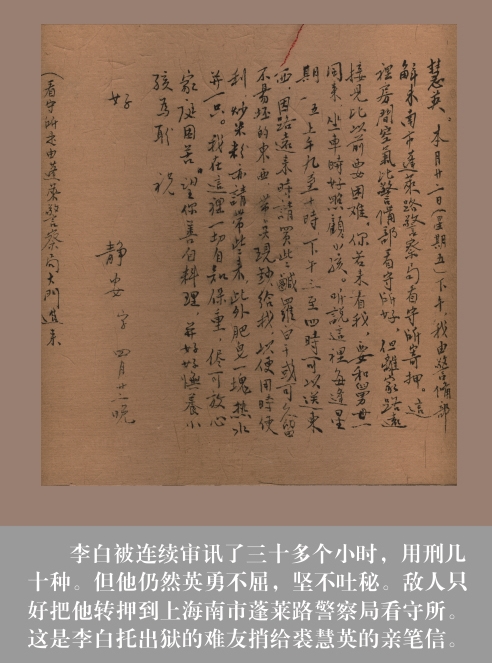 1942年9月,日军在对秘密电台的侦测中,逮捕了李白夫妇。日寇对李白施以种种酷刑,但他坚不吐秘,一口咬定自己的是私人电台。1943年5月,李白经党组织营救获保释。