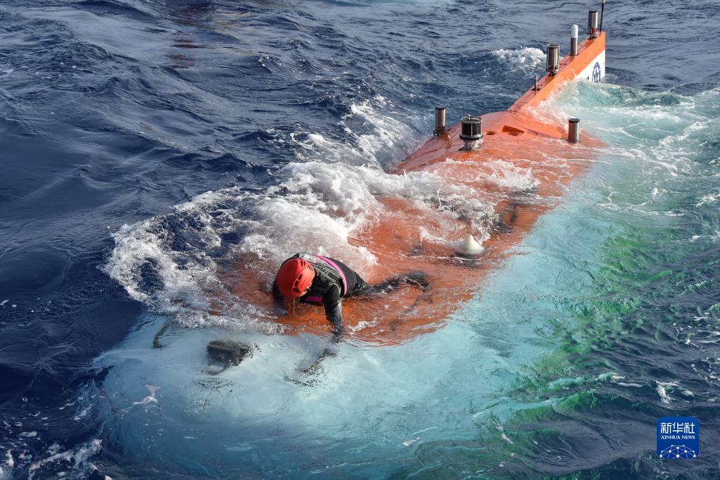 “奋斗者”号在西太平洋入水后,“蛙人”解开拖拽缆(9月9日摄)。新华社记者 陈凯姿 摄