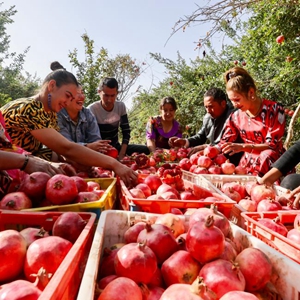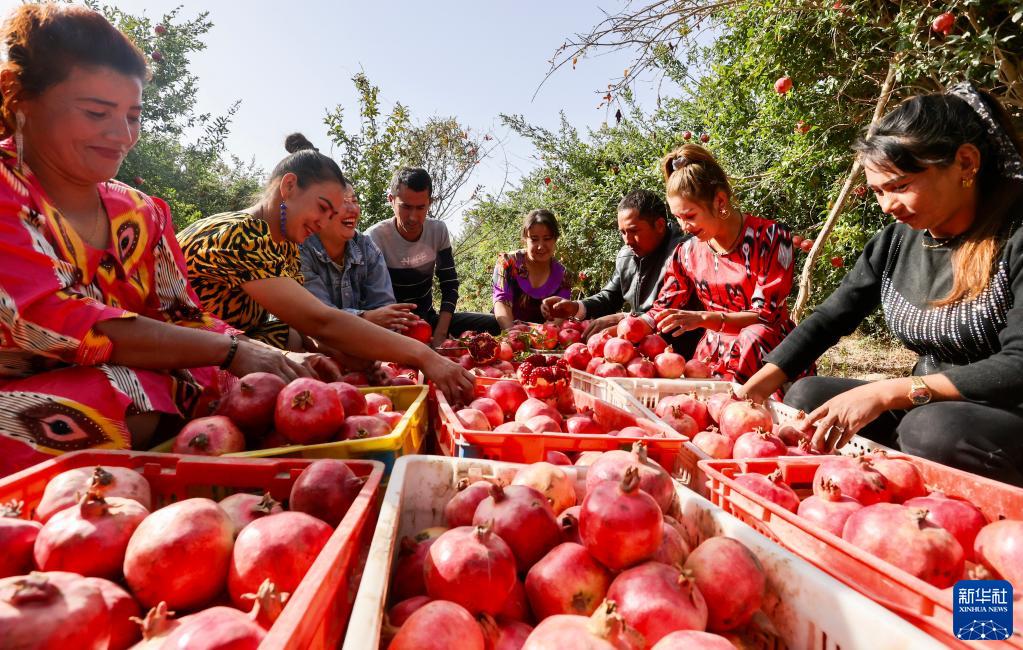 10月1日,新疆和田地区策勒县策勒乡托帕村的村民在采摘石榴。新华社发(许晓龙 摄)