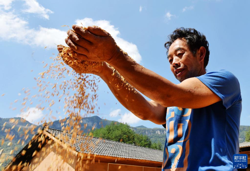 10月3日,在重庆市酉阳土家族苗族自治县花田乡何家岩村,村民在晾晒水稻。新华社记者 黄伟 摄