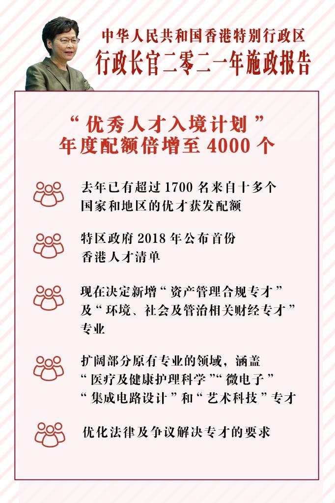 新华社香港10月6日电(记者刘明洋)香港特区行政长官林郑月娥6日上午在特区立法会发表她任期内的第五份施政报告。林郑月娥表示,决定进一步将“优秀人才入境计划”的年度配额倍增至4000个,以吸引世界各地优才来港工作。