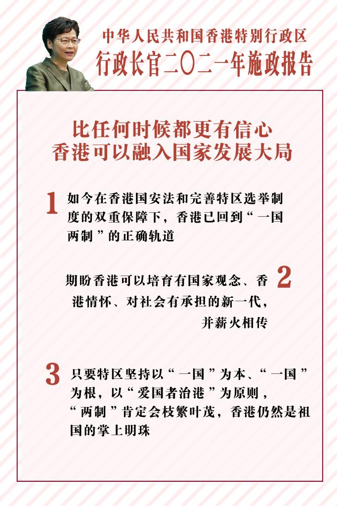 林郑月娥表示,她比任何时候都更有信心、更肯定,香港可以融入国家发展大局,在国家迈向第二个百年奋斗目标的进程中发挥不可替代的作用;也更期盼香港可以培育有国家观念、香港情怀、对社会有承担的新一代,并薪火相传。