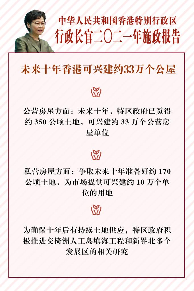 私营房屋方面,林郑月娥说,特区政府争取未来十年准备好约170公顷土地,提供可兴建约10万个单位的用地。她表示,为确保十年后有持续土地供应,特区政府正积极推进交椅洲人工岛填海工程和新界北多个发展区的相关研究,并建议检视“绿化地带”的发展潜力。