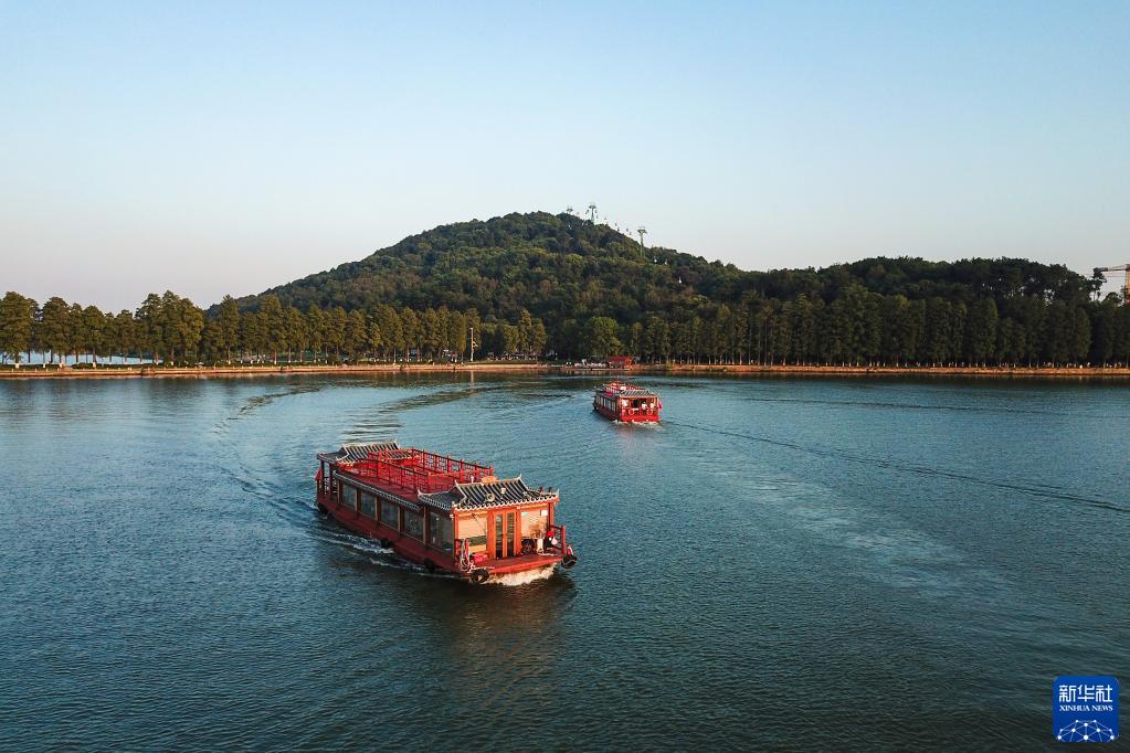 10月4日,游客在武汉市东湖景区乘坐湖景观光船(无人机照片)。