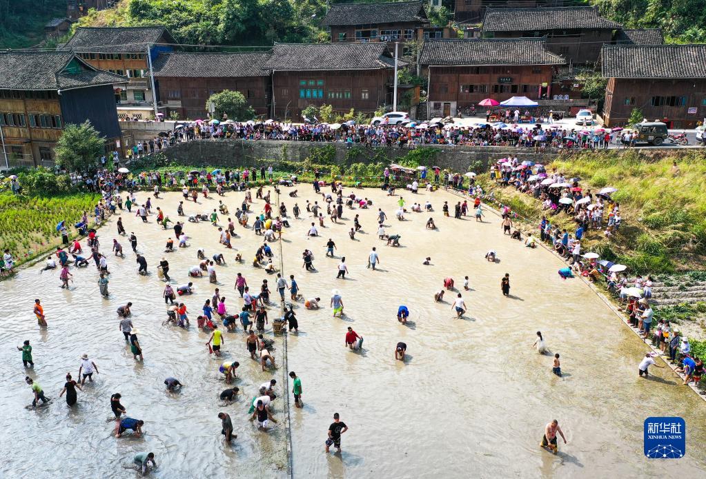 10月2日,在贵州省黔东南苗族侗族自治州剑河县太拥镇昂英村,游客和村民参加抓鱼比赛(无人机照片)。