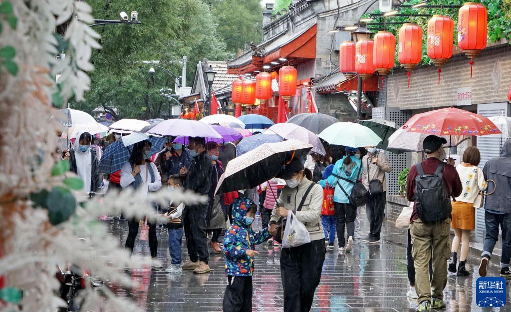 10月6日,游人冒雨来到北京南锣鼓巷游玩。