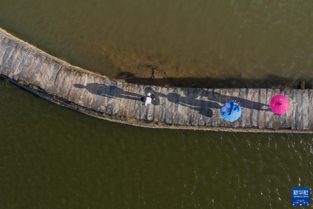 10月7日,市民在福建莆田木兰陂公园游玩(无人机照片)。