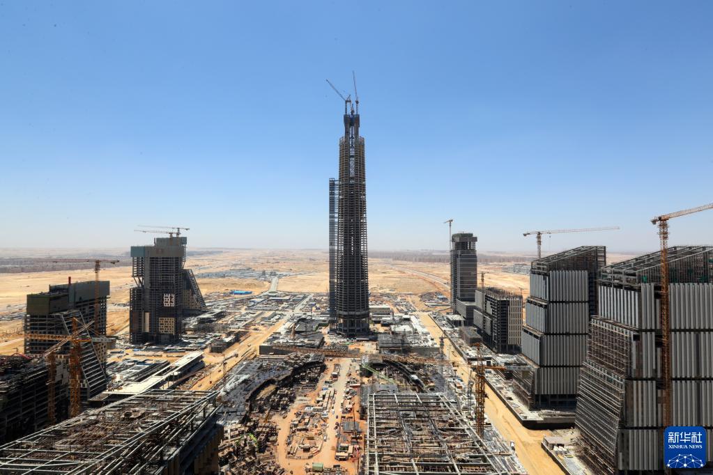 这是2021年6月17日拍摄的埃及新首都中央商务区标志塔(中)主体建筑封顶建设现场。新华社记者 隋先凯 摄