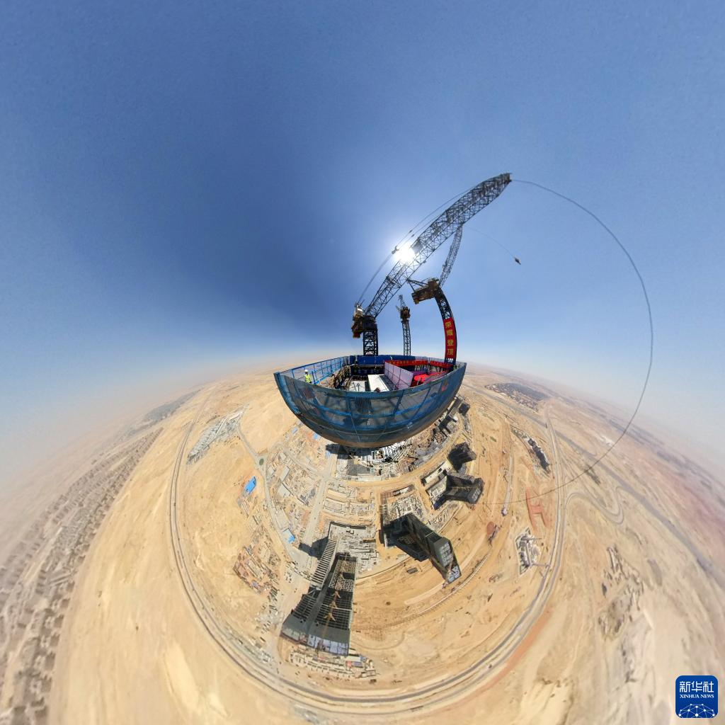 这是2021年6月17日拍摄的埃及新首都中央商务区标志塔主体建筑封顶建设现场(全景相机拍摄)。新华社记者 隋先凯 摄