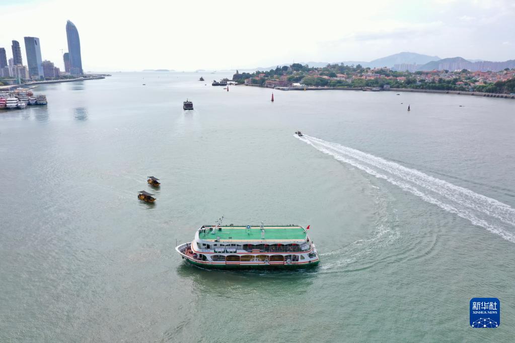 10月8日,轮渡、游船及渔船行驶在厦门鼓浪屿附近海面上(无人机照片)。