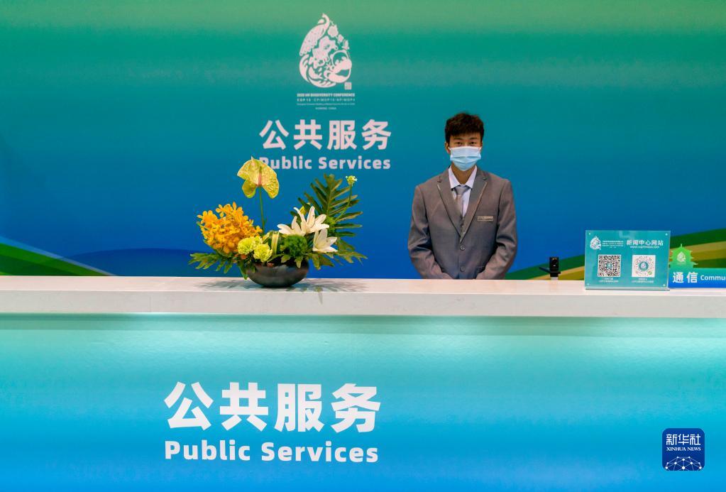 10月9日,一名工作人员在COP15新闻中心公共服务区值守。新华社记者 陈欣波 摄