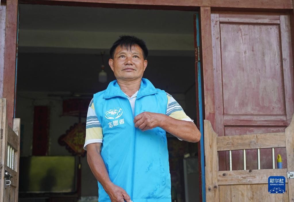 在江西省遂川县营盘圩乡桐古村,曾昭富在家门前穿好工作服,准备去保护管理站工作(9月28日摄)。
