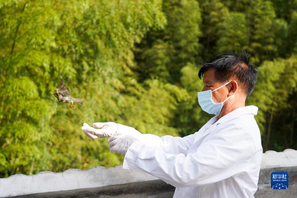 在江西南风面国家级自然保护区管理局营盘圩保护管理站,曾昭富将一只环志后的红嘴相思鸟放飞(9月27日摄)。