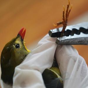在江西南风面国家级自然保护区管理局营盘圩保护管理站,曾昭明在观察一只栗耳凤鹛(9月27日摄)。