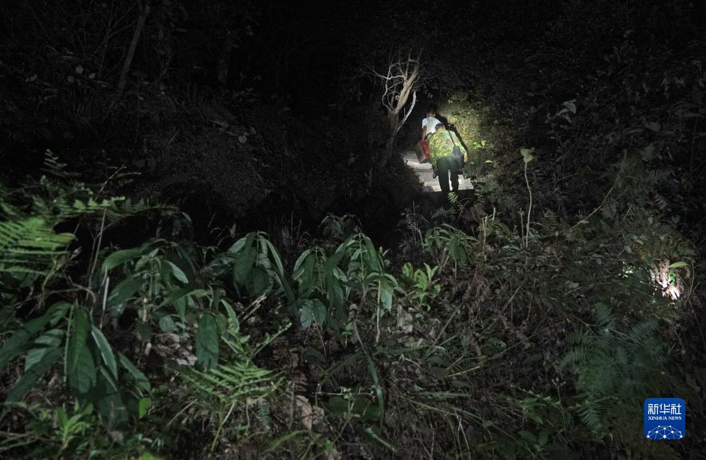 在江西省遂川县营盘圩乡,曾昭明和曾昭富兄弟俩上山察看捕鸟网(9月27日摄)。捕捉到的鸟类将由当地鸟类环志站的专家进行环志后放飞。