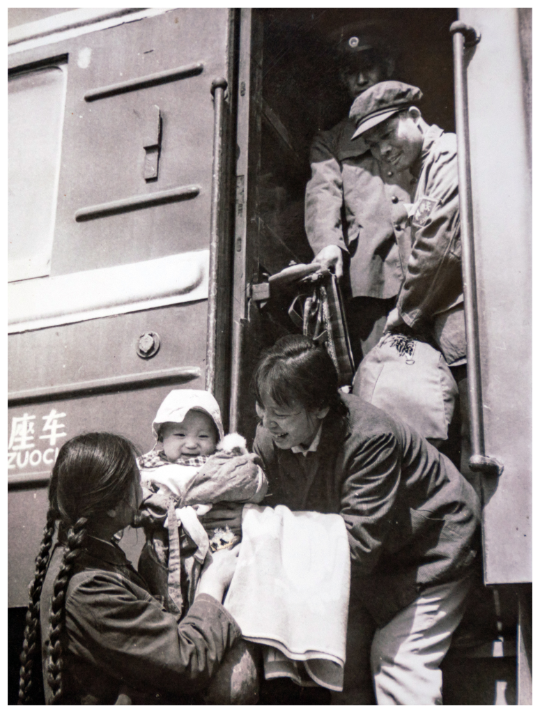 列车长何斯瑛(右一)和列车员元桂兰(左三)帮助带孩子的乘客下火车(资料照片)。(受访者供图)