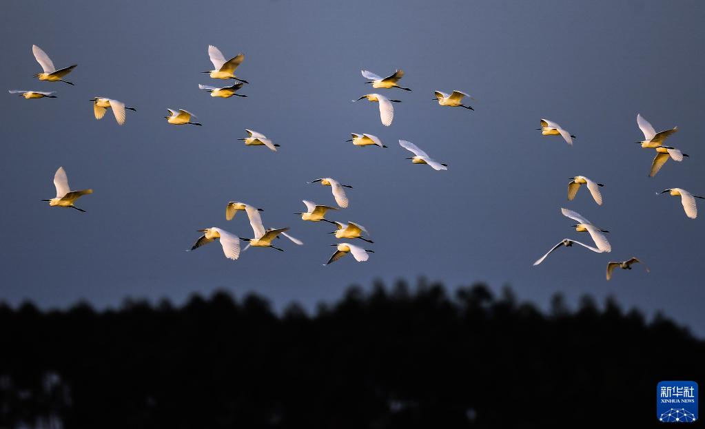 这是晚归的白鹭从广西钦州茅尾海的一处红树林上空飞过(2018年12月5日摄)。