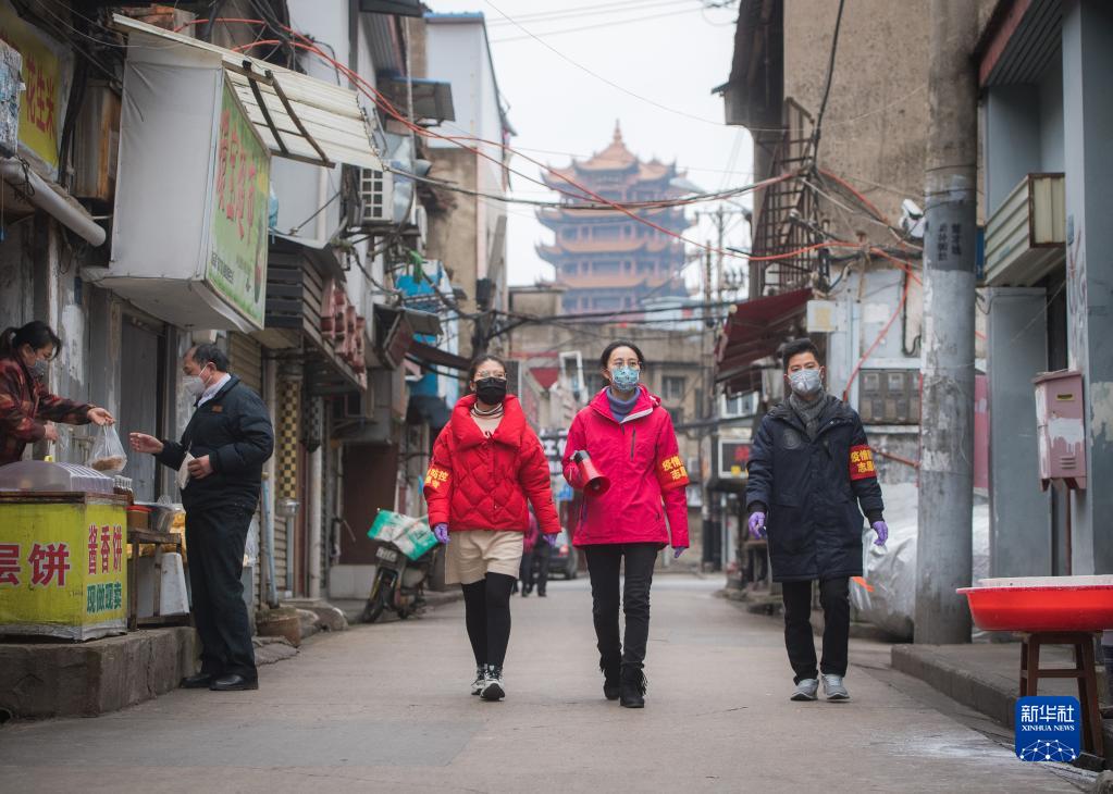 2020年2月7日,湖北省武汉市中华路街西城壕社区党委书记翁文静(右二)与志愿者柳莹(右三)、张琦(右一)上街进行防疫宣讲。