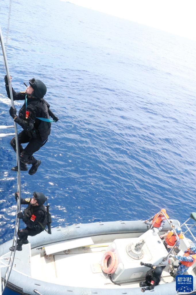 海军第38批护航编队南京舰组织随舰陆战队员开展舰舷攀爬训练(5月20日摄)。新华社发(石小强 摄)
