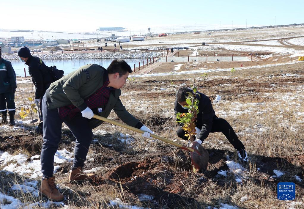 10月10日,人们在蒙古国首都乌兰巴托市纳来哈区植树。新华社发(苏力雅 摄)
