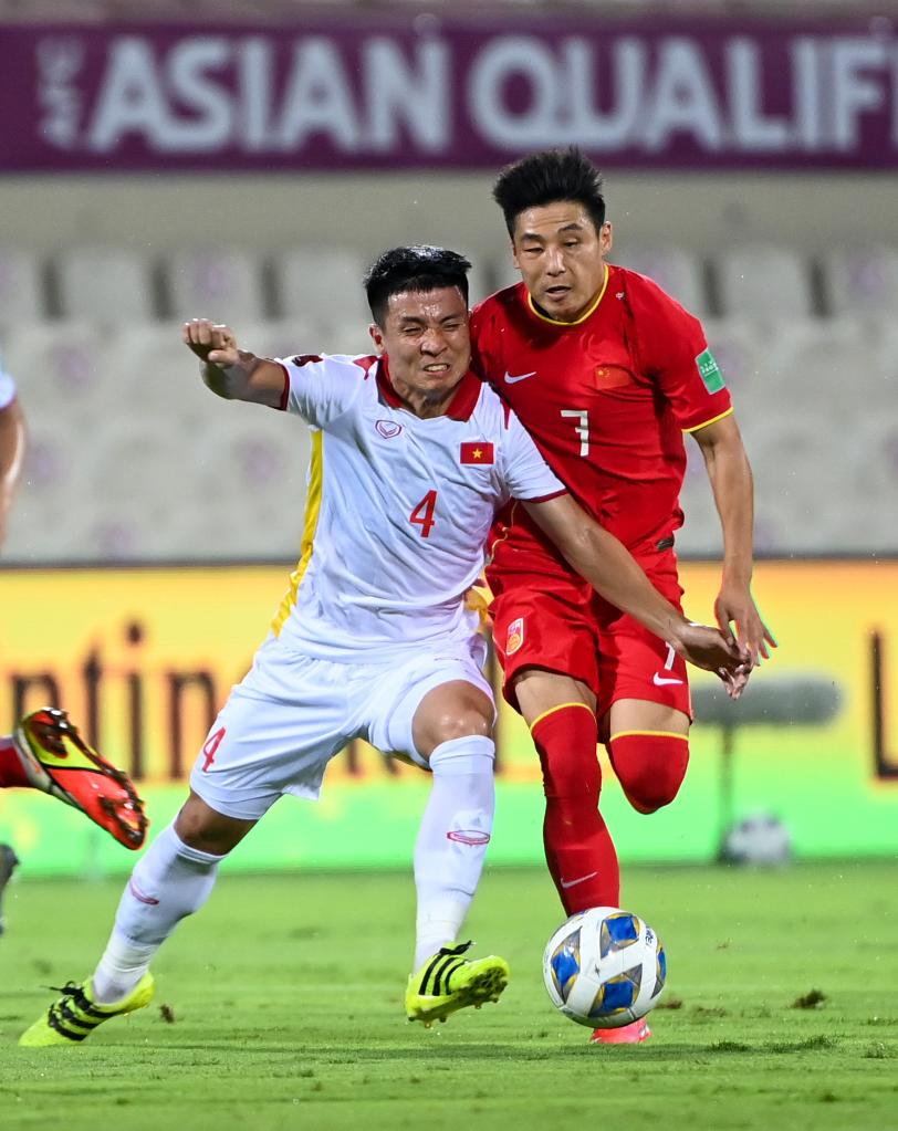 10月7日,世预赛12强赛,中国队球员武磊(右)与越南队球员裴进勇拼抢。新华社发