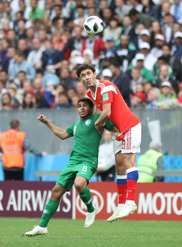 2018年6月14日,俄罗斯世界杯,俄罗斯队球员加辛斯基(右)与沙特阿拉伯队球员谢赫里在揭幕战中拼抢。新华社记者徐子鉴摄