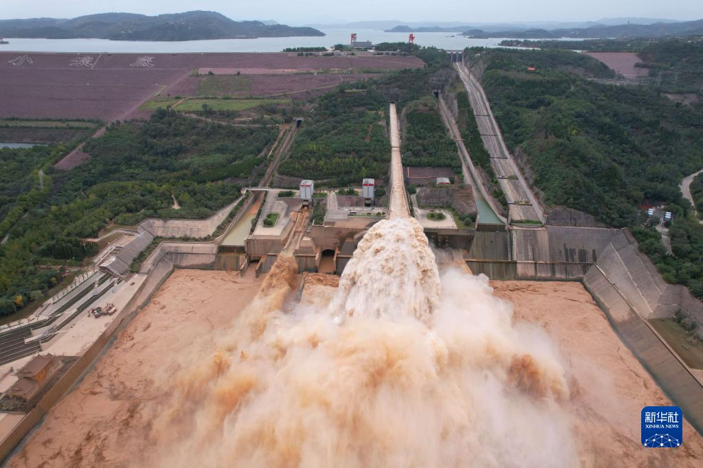 10月10日拍摄的黄河小浪底水库泄洪场景(无人机照片)。新华社记者 刘诗平 摄