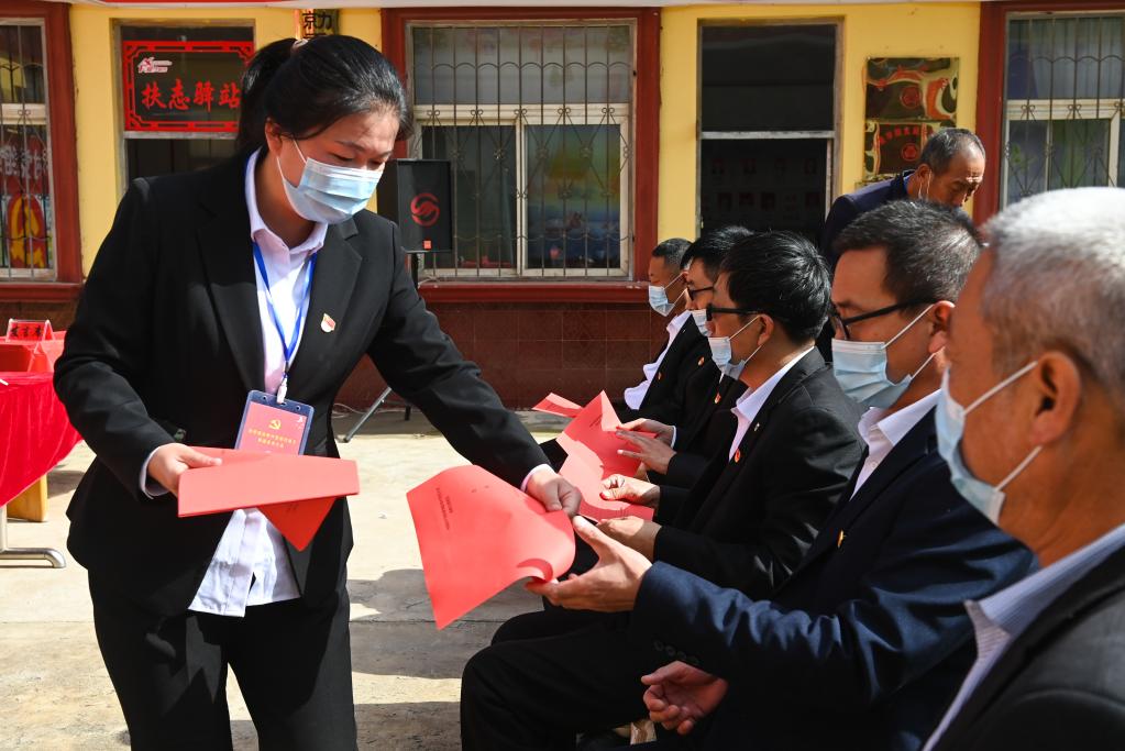 10月11日,在山西省汾西县勍香镇勍香村党支部委员换届选举大会现场,工作人员正在发选票。新华社记者 柴婷 摄