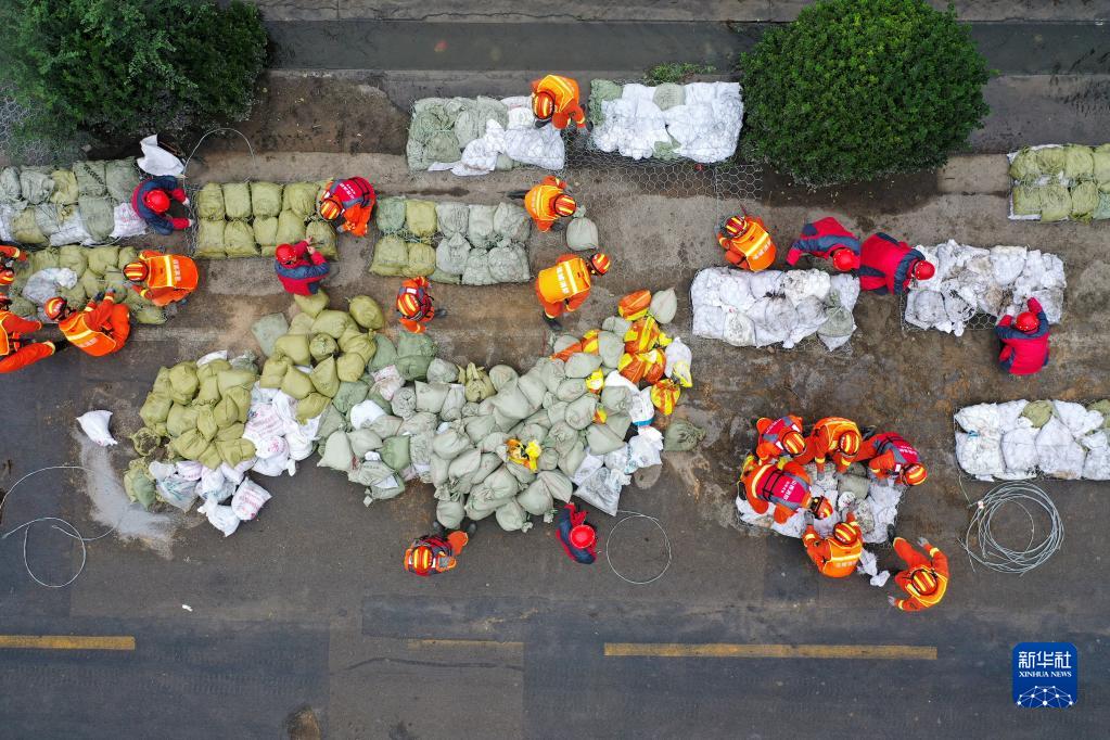 在汾河下游稷山段下迪河坝段,抢险人员在加固堤坝(10月11日摄,无人机照片)。