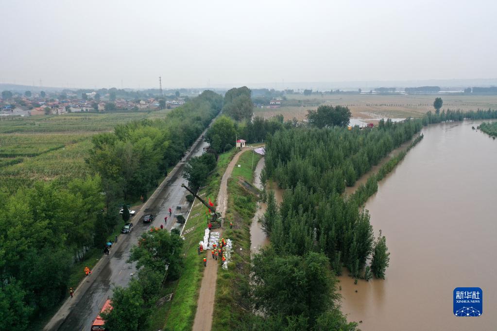 10月11日,抢险人员在汾河下游稷山段下迪河坝段加固堤坝(无人机照片)。