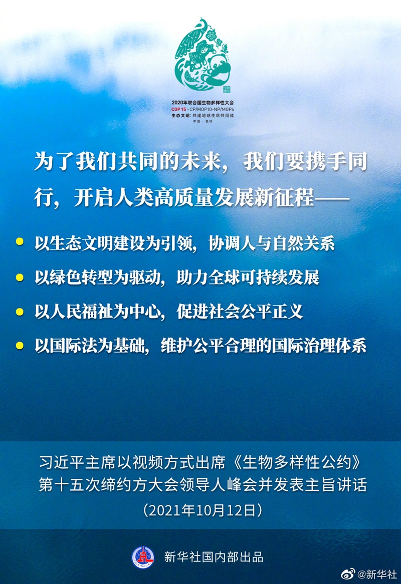 国家主席习近平12日下午以视频方式出席《生物多样性公约》第十五次缔约方大会领导人峰会并发表主旨讲话。