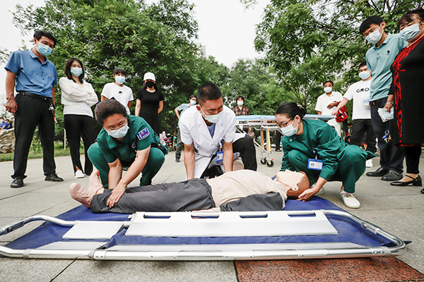 9月11日,医务人员在河北唐山遵化市遵化镇南关村社区公园进行伤员运送急救演练。新华社发(刘满仓 摄)