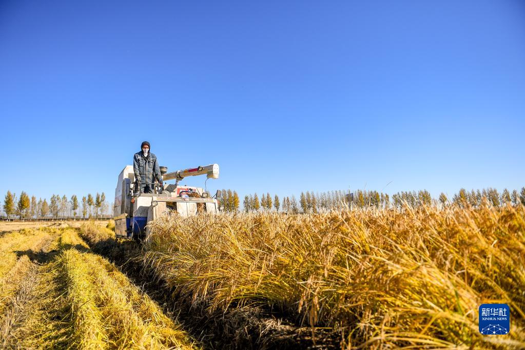 金秋时节,吉林省水稻主产区之一吉林市永吉县万昌镇进入水稻收获季,金黄遍野,稻浪滚滚,一派丰收景象。农民利用晴好天气抓紧秋收。