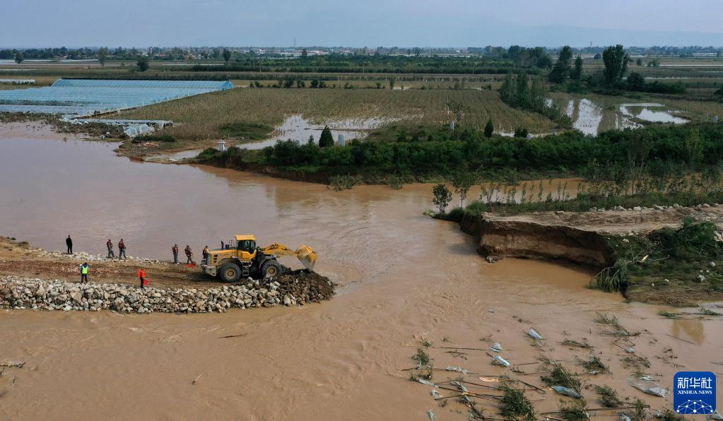 陕西大荔县朝邑生产围堤紫阳村段决口填堵现场(10月12日摄,无人机照片)。