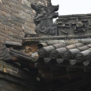 全国重点文物保护单位山西省汾城古建筑群的城隍庙一处建筑檐部瓦件脱落(10月12日摄)。