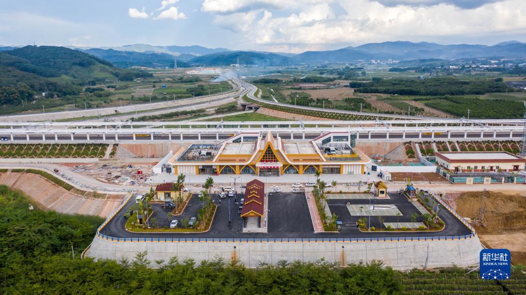 9月28日拍摄的中老铁路橄榄坝站(无人机照片)。新华社记者 胡超 摄