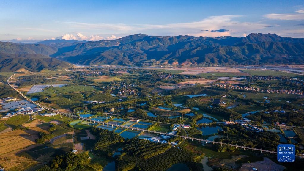 9月28日拍摄的中老铁路橄榄坝特大桥(无人机照片)。新华社记者 胡超 摄