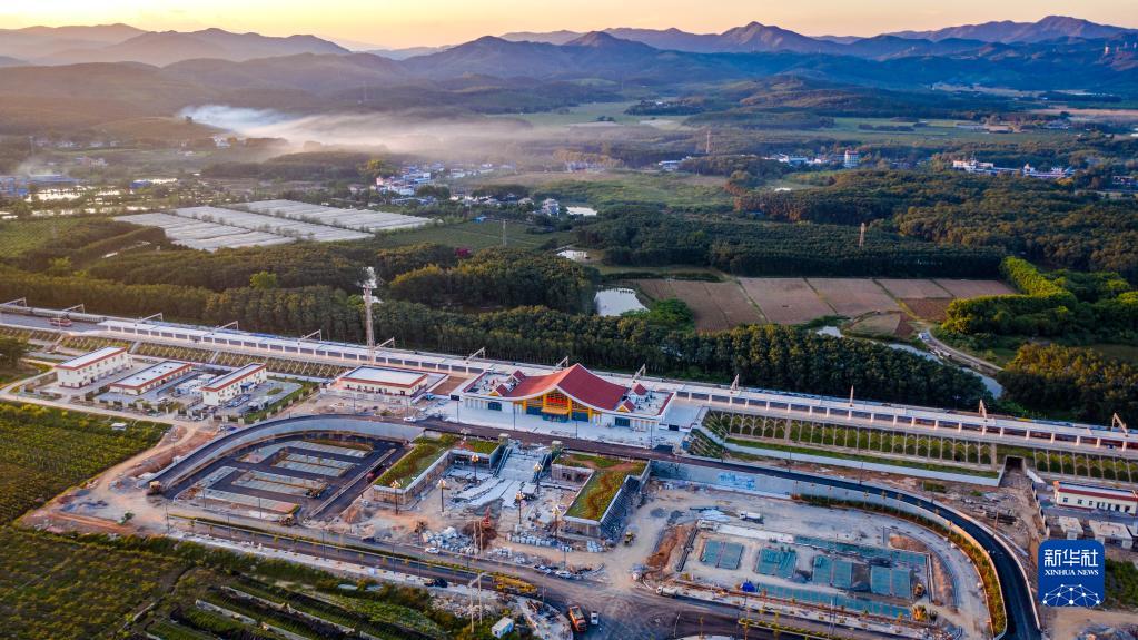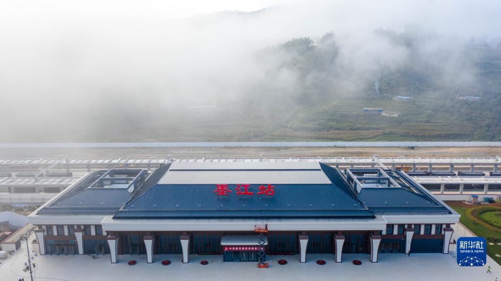 9月28日拍摄的中老铁路墨江站(无人机照片)。新华社记者 胡超 摄
