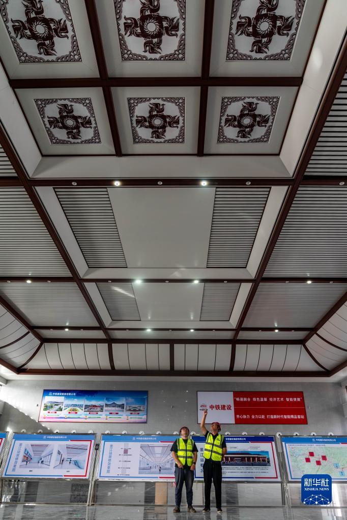 9月28日拍摄的中老铁路墨江站候车大厅。吊顶中间区域装饰有哈尼族群众喜爱的白鹇鸟环抱太阳的图案。新华社记者 胡超 摄