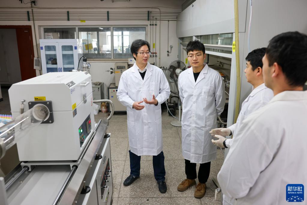 在中国科学院重庆绿色智能技术研究院的实验室内,全国人大代表史浩飞(左一)利用工作间隙和青年科研人员交流(2021年2月8日摄)。