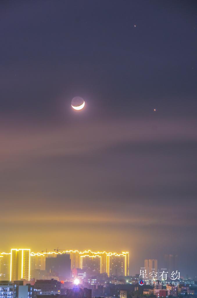 这是广东省潮州市天文摄影爱好者吴柏栋2019年11月28日在湛江市拍摄到的“金木伴月”。(本人供图)