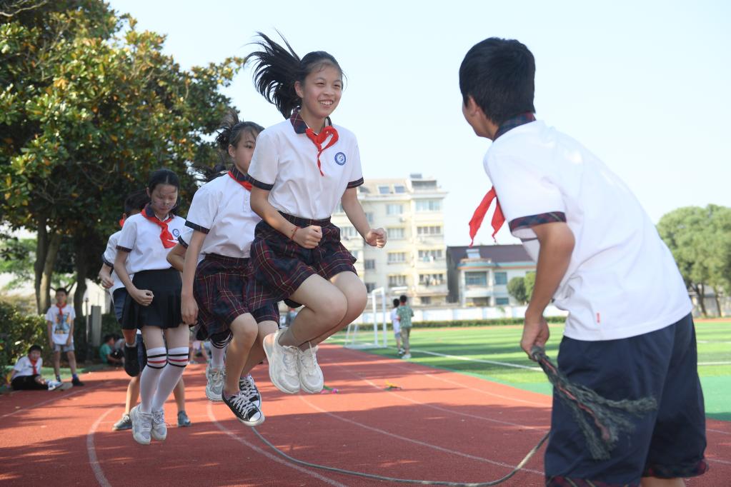 9月23日,湖州市吴兴区埭溪镇上强小学学生在校园里跳绳。新华社记者翁忻旸 摄