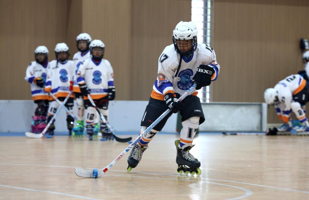 9月29日,在石家庄市柏林庄学校,学生在进行轮滑球训练。新华社发(梁子栋摄)