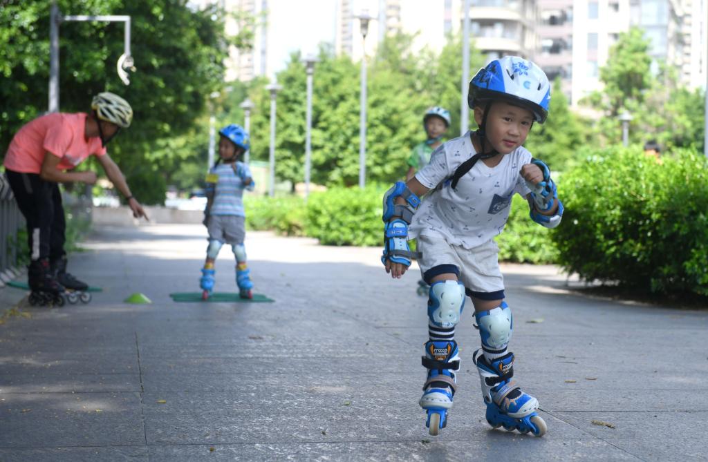 在广州,学习滑旱冰的孩子们。新华社记者卢汉欣摄