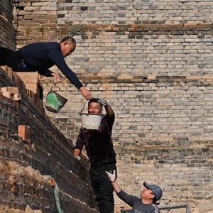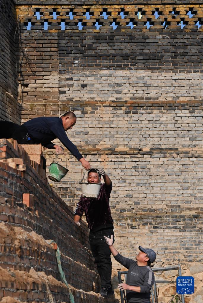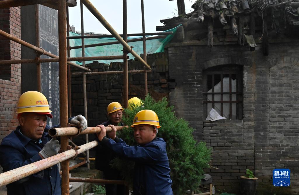 10月13日,工人在山西省洪洞县苗村祖师庙搭建脚手架,准备开展修缮工作。新华社记者 马毅敏 摄