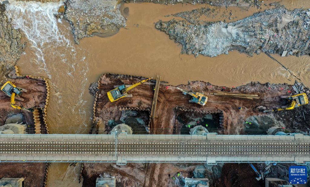 10月13日,施工人员在南同蒲铁路昌源河大桥抢险现场作业(无人机照片)。