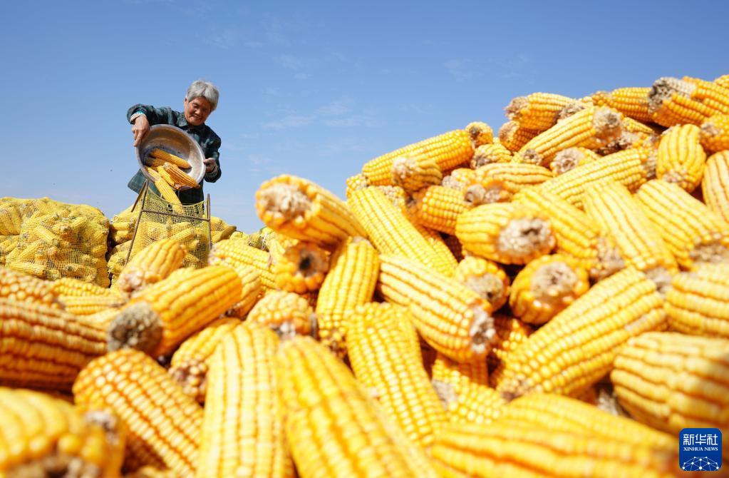 10月13日,河北省邢台市内丘县小辛庄村农民将玉米装袋,准备晾晒。