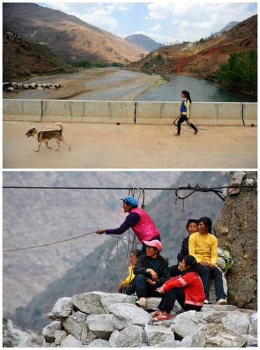 上图:威宁县海拉镇海元村村民通过大桥到云南省会泽县矿山镇(2018年3月13日摄);下图:云南省会泽县火红乡的村民牵引溜索过江(2013年3月7日摄) 新华社记者 杨文斌摄