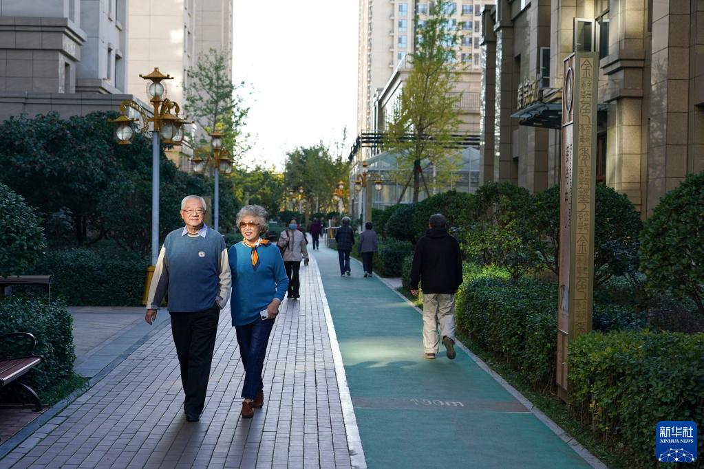 10月11日,在位于河北燕郊的燕达金色年华健康养护中心,吕伟业(左)和李战平在散步。